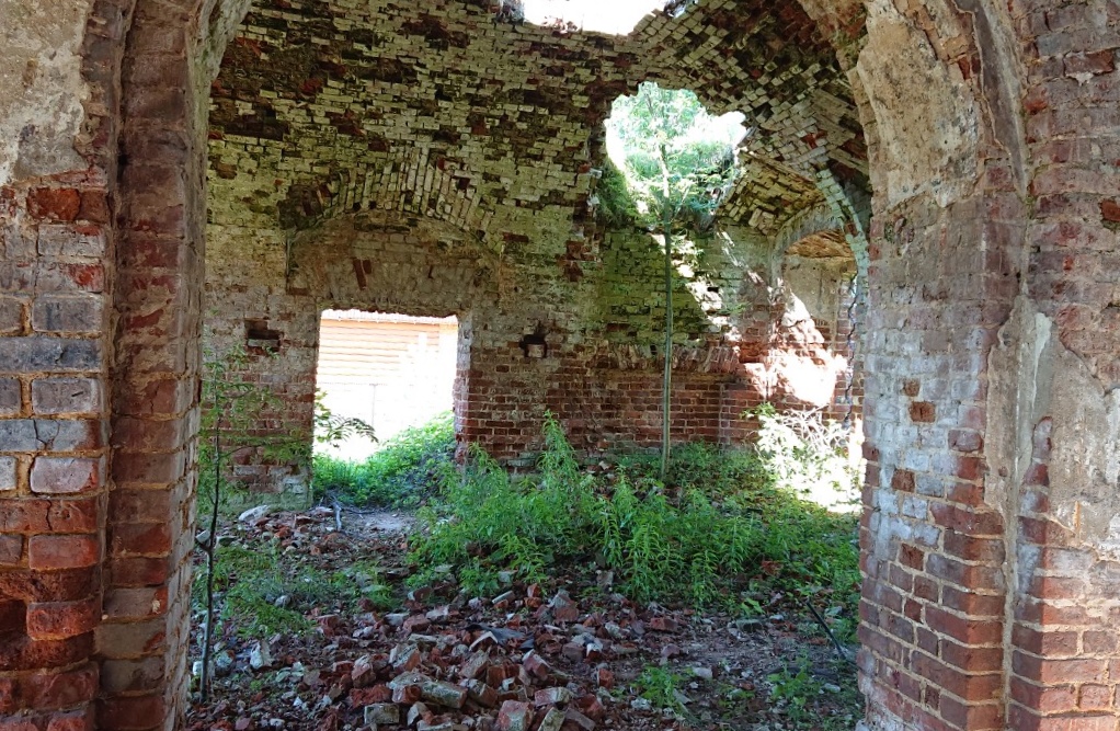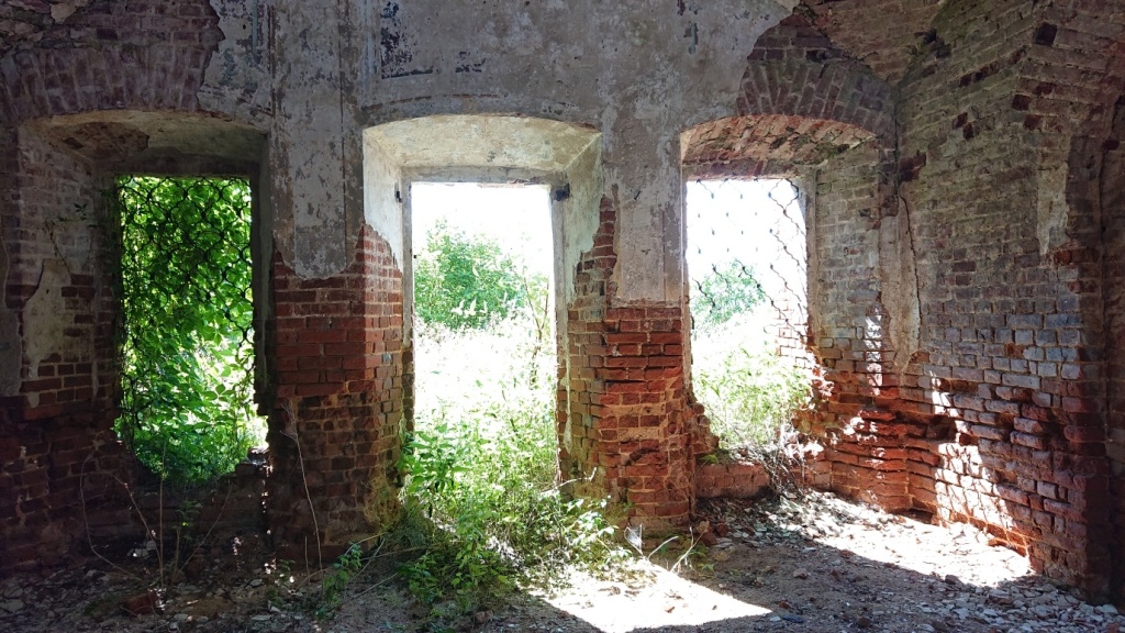 Рассматриваем храм вместе с Аленой Владимировной. Она показывает, где были дыры в сводах, где выбитые проломы в стенах. На тот момент сохранившаяся кладка кирпича покрылась зеленой плесенью. Пола не было вовсе. А в храме располагался клуб, мельница, а затем конюшня. Для нужд клуба и выбили проходы в стенах – туда подъезжала машина с проектором. Нашли в руинах и бетонные жернова. Внутри руин храма все было засыпано битым кирпичом.