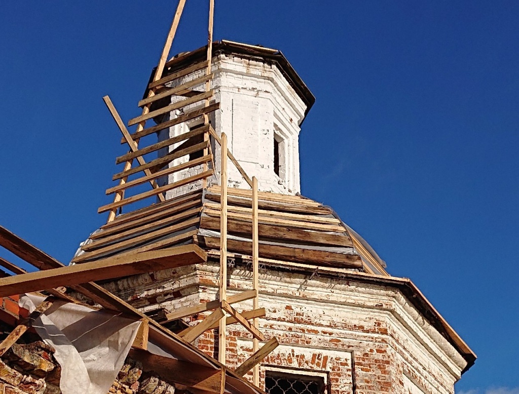 Через месяц в пруду уже плавали два экскаватора. Неизвестный москвич прислал вместе с техникой людей и оплатил все работы. Ответ оставался за местными жителями. Но и в этот момент о восстановлении речь не шла, хотели просто провести консервационные работы: в храме разрушался свод, в потолке были большие дыры, над трапезной частью вообще крыши не осталось. Решили с нее и начать.