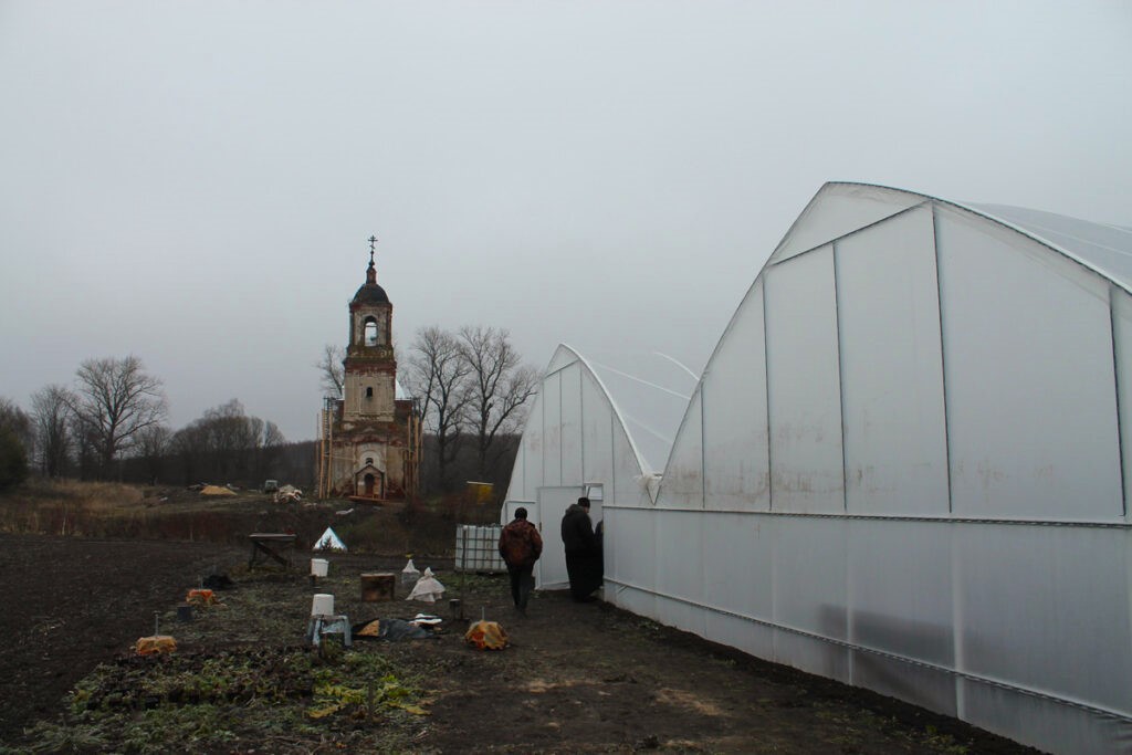 Прежде чем оказаться в Никольском храме села Кудлей, мы зашли в одно любопытное место. Два брата, Феофан и Михаил, выращивают клубнику и делают это, можно сказать, в промышленных масштабах. Из маленького деревянного домика вышли два симпатичных молодых человека и показали нам свои угодья. В огромных теплицах, на установку которых они взяли большой кредит, зеленели пушистые кустики ремонтантной клубники. В течение пяти месяцев она радует свежими и сочными плодами, однако чтобы их добиться, надо трудиться не покладая рук. Что и делают эти скромные труженики.