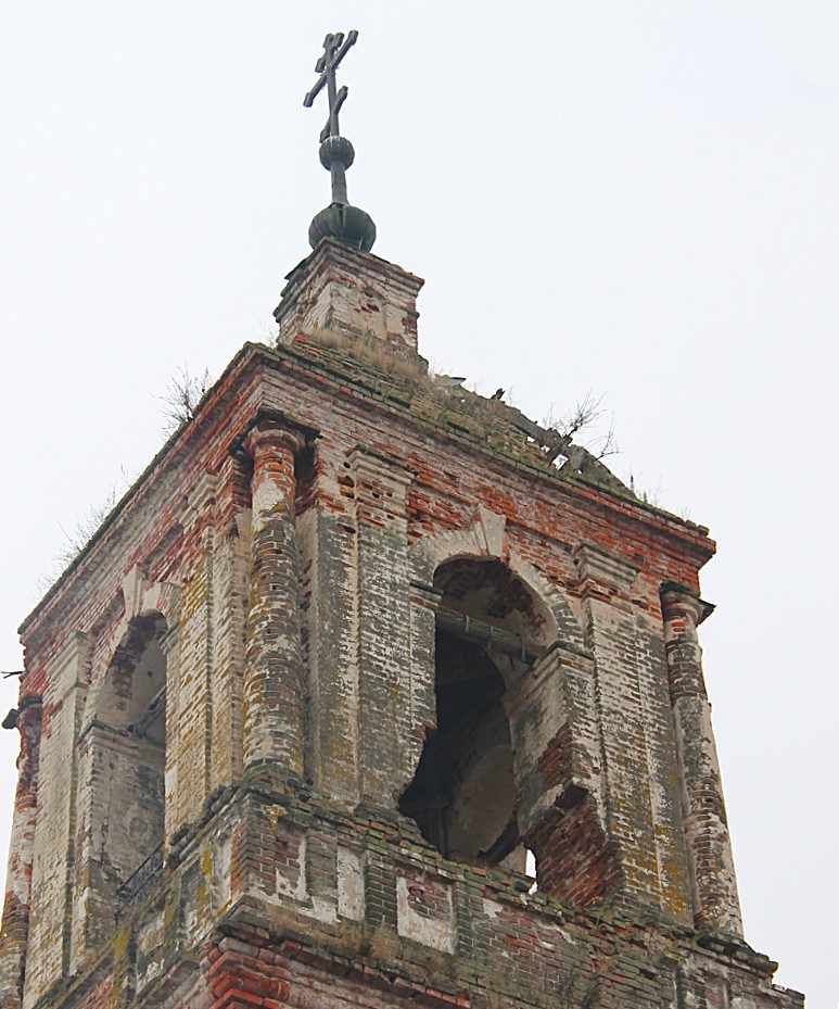 Вместе мы выходим из храма и осматриваем его с улицы. Над четвериком воздвигнут купол, над куполом – новый крест. А вот над колокольней чудом уцелел древний крест. В богоборческие годы Никольский храм лишился голоса. Это произошло самым варварским способом. Огромный колокол было невозможно сбросить, и потому прорубили часть стены. Смотрим снизу на эту рану в стене и видим, что по форме она напоминает форму колокола. Прошло почти 100 лет с тех страшных времен, но раны до сих пор не уврачёваны.