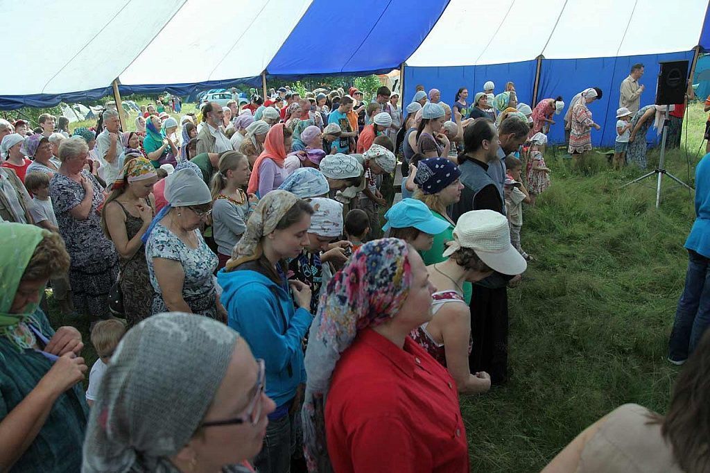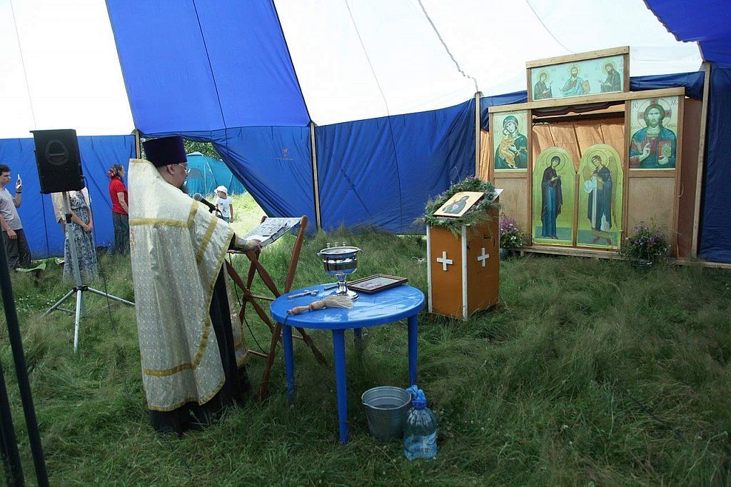 Всякое доброе православное дело начинается с молитвы – вот и слёт открылся молебном и крестным ходом. Сначала все вместе помолились в походном храме на центральной поляне, а затем священник Александр Невзоров окропил святой водой территорию, на которой проходит слет.