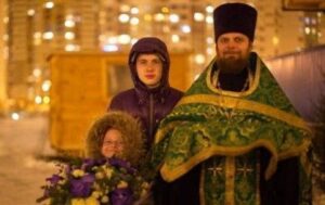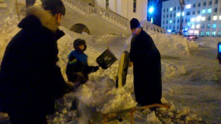 Магаданцы во главе с архипастырем расчищают площадь кафедрального собора от снежных заносов
