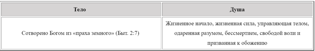 По мнению отцов-дихотомистов, тело человека создано Богом из праха земного, а душа – из жизненного начала, жизненной силы, управляющей телом, наделенной бессмертием, разумом, свободой воли и призванной к обожению. То есть дихотомисты не разделяют душу и дух.