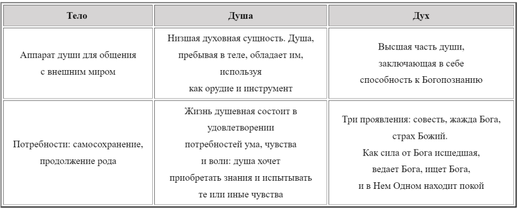 Отцы-трихотомисты говорят о теле как аппарате души для общения с внешним миром, о душе как о низшей духовной сущности. Душа, пребывая в теле, благодаря этому использует его как орудие и инструмент. Душевная жизнь состоит в удовлетворении ума, чувств, воли. Душа хочет приобретать знания, испытывать те или иные чувства. А дух есть высшая часть души. Хотя при трихотомическом подходе выделяют третью часть — дух, но говорят о нем как о части души (поэтому отцы-дихотомисты не противоречат отцам-трихотомистам). И эта высшая часть души заключает в себе способность к богопознанию.