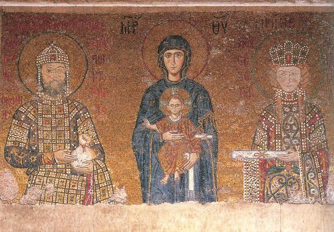 Например, созданные в технике мозаики портреты императора Иоанна II Комнина и императрицы Ирины, изображенных возле Богородицы на юго-восточной стене хоров Собора Святой Софии в Константинополе, противоречат тому, что мы бы сейчас назвали нормальным и каноничным: в них нет ни соразмерности, ибо императорские особы изображены не уменьшенными в размере по сравнению с Богородицей, как следовало по теории иконографии, а равного с ней роста. Более того, они изображены с нимбами, которые усвоены святым, хотя только императрица Ирина была позднее канонизирована.