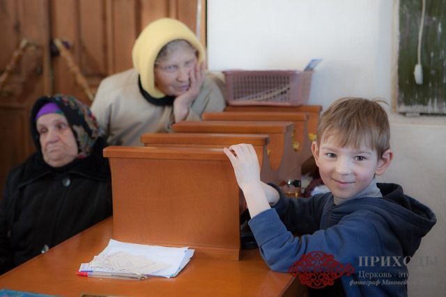 Теперь мои младшие по очереди помогают: один в алтаре, другой за свечным ящиком.
