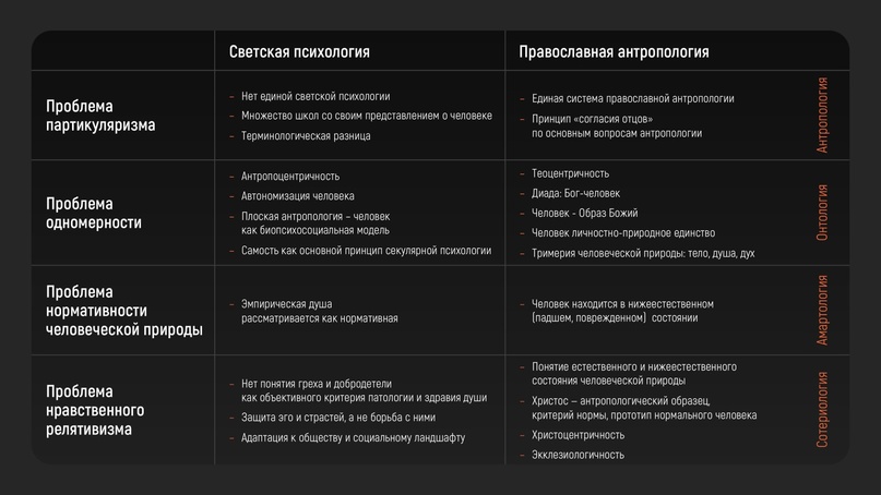Если православное учение о человеке представляет собой относительно единую и непротиворечивую антропологическую систему с принципом «согласия отцов» по ключевым вопросам, то современная психология представляет собой конгломерат феноменов, фактов, школ, направлений, часто почти никак друг с другом не связанных. Это взаимопротиворечивый сплав методологий, в котором отсутствует общая базовая терминология. Нет единой светской психологии – есть много «психологий», множество школ, каждая из которых формулирует свою концепцию человека. В современном мире насчитывается более 400 отраслей, школ и направлений светской психологии, которые не имеют единой неизменной основы, общего фундамента. Практически каждая крупная психологическая школа предлагает свое ви́дение человека, которое лишь отчасти коррелирует с другими психологическими антропологиями, а часто находится в остром противоречии с ними. Это напоминает известную притчу о слепых и слоне.