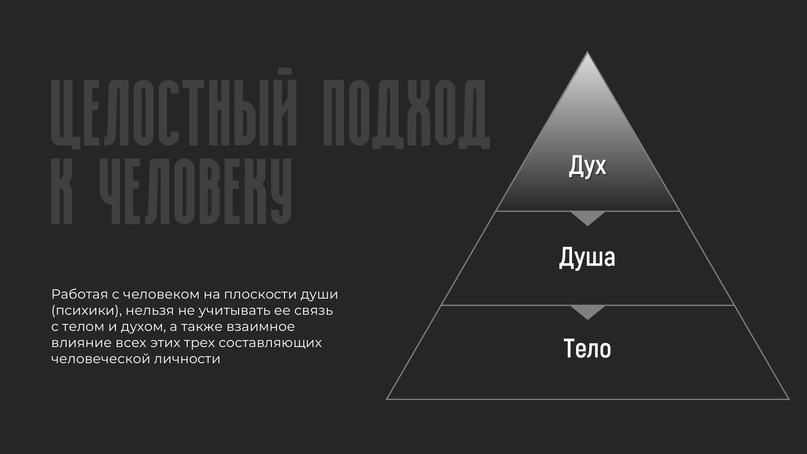 Целостный подход к человеку и предлагают применять православные психологи и психотерапевты. Работая с человеком на плоскости души (психики), нельзя не учитывать ее связь с телом и духом, а также взаимное влияние всех этих трех составляющих человеческой личности.