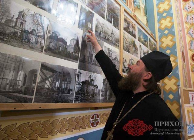 После войны храм стоял заброшенным и медленно разрушался. Когда люди сюда пришли, увидели, прежде всего, горы мусора. Активисты сами собрались, устроили субботник, разгребли горы свалки внутри, расчистили пол. Однако были и неприятные моменты. В храме под горой мусора сохранилась хорошая плитка на полу. И кто-то стал по ночам приходить, разобрали половину пола. Нашли старую крестильную купель, медную, хорошую — кто-то ее тут же утащил. Когда я приехал, рассказывали, что вот, батюшка, была купель — теперь нет.