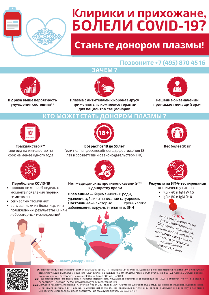 «Переливание плазмы крови от переболевших COVID-19 является одним из самых действенных способов лечения коронавирусной инфекции при ее тяжелом течении. К сожалению, сейчас московские больницы сталкиваются с крайней нехваткой людей, готовых сдать свою кровь. Переболевший ковидом может не только радоваться своему выздоровлению, но и помочь тому, кто сейчас тяжело болен и страдает», – подчеркнул в эксклюзивном комментарии порталу «Приходы» епископ Орехово-Зуевский Пантелеимон, председатель Синодального отдела по церковной благотворительности и социальному служению.