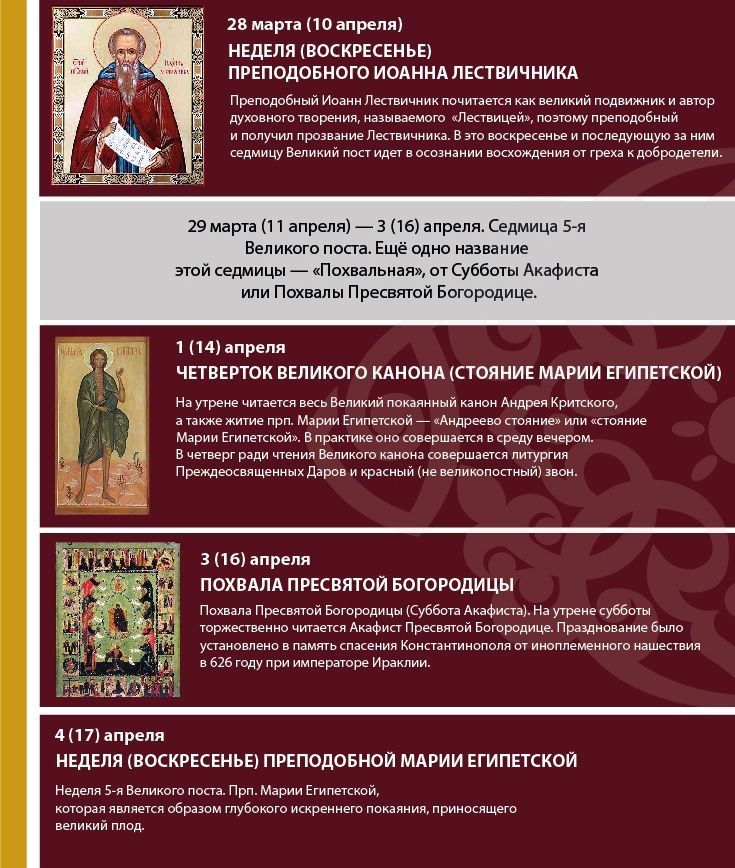 На пятую неделю падает празднование памяти преподобной Марии Египетской, которая жила в середине V и в начале VI столетия. Ее молодость не предвещала ничего хорошего. Марии исполнилось лишь двенадцать лет, когда она ушла из своего дома в городе Александрии. Будучи свободной от родительского надзора, молодой и неопытной, Мария увлеклась порочной жизнью. Некому было остановить ее на пути к погибели, а соблазнителей и соблазнов было немало. Так 17 лет Мария жила в грехах, пока милостивый Господь не обратил ее к покаянию.